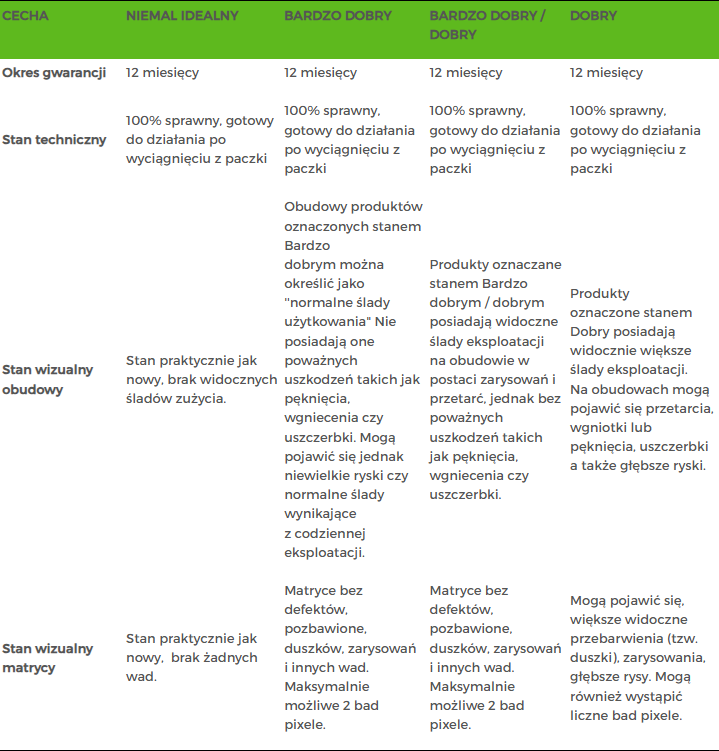 Dobry - to sprzęt przeznaczony dla osób, które estetykę stawiają na drugim miejscu, a ważny dla nich jest stosunek ceny do jakości. W przeciwieństwie do stanu Bardzo dobry cechują się bardziej widocznym zużyciem wizualnym. Możliwe są również pęknięcia i niewielkie uszczerbki w obudowach oraz skazy na matrycach w postaci rozświetlonych punktów (duszków) czy rys.