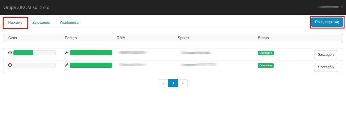 Dzięki założeniu konta mają Państwo dostęp do podglądu wszystkich swoich zgłoszeń reklamacyjnych, ich postępu oraz aktualnego statusu, a przede wszystkim do zgłoszenia reklamacji online. Żeby dodać nowe zgłoszenie reklamacyjne należy przejść do zakładki "Naprawy" i kliknąć przycisk "Dodaj zgłoszenie awarii" u góry strony: